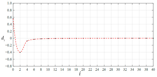 The undetermined constants c0 and d0 are calculated by using Equations (28) and (29), where the value of the parameter n begins first with 2, then n = 4, n = 6, …, and does not stop until the calculated numerical values of c0 and d0 are sufficiently saturated, as shown in Table 1, where H = 300 mm. The variations of c0 and d0 with n are shown in Figure 3 and Figure 4. It can be seen from Figure 3 and Figure 4 that c0 and d0 converge very well as the parameter n progressively increases. Therefore, the coefficients ci and di can be calculated using c0 = 0.19801 and d0 = 0.38702301, i.e., the saturated values of b0 and d0 when n = 34 in Table 1, and the calculated results of ci and di are listed in Table 2. The variations of ci and di with i are shown in Figure 5 and Figure 6. It can be seen from Figure 5 and Figure 6 that ci and di converge very quickly as i progressively increases. This means that the power-series solutions of stress and deflection converge very well at the right end of the interval x∈[0, 1], i.e., at x = 1. On the other hand, the power-series solutions of stress and deflection converge to c0 and d0 at the left end of the interval x∈[0, 1] (i.e., at x = 0, see Equations (24) and (25)); therefore, they converge in the whole interval x∈[0, 1].