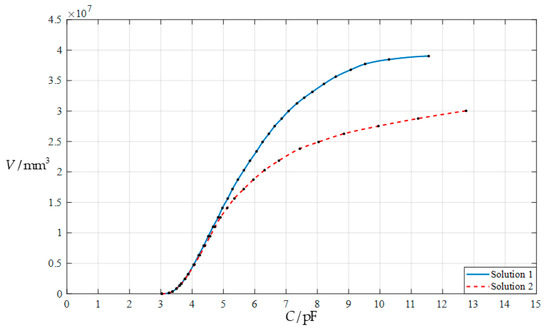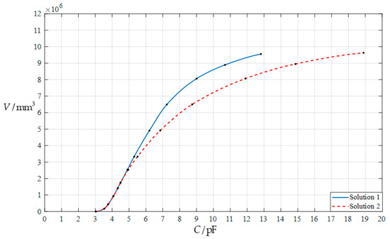 The numerical results calculated by using the deflection solutions presented in Section 2, including the volume V and height H of the applied rainwater, the undetermined constants c0 and d0, the maximum stress σm and maximum deflection wm of the conductive circular membrane, and the total capacitance C, are listed in Table 5 for E = 7.84 MPa, in Table 6 for E = 3.05 MPa, and in Table 7 for E = 1.55 MPa, respectively. The numerical results calculated by using the deflection solutions presented in [13] are listed in Table 8 for E = 7.84 MPa, in Table 9 for E = 3.05 MPa, and in Table 10 for E = 1.55 MPa, respectively. The graphical relationships between the input capacitance C and output volume V are shown in Figure 12 for E = 7.84 MPa, in Figure 13 for E = 3.05 MPa, and in Figure 14 for E = 1.55 MPa, respectively, where “Solution 1” refers to the results calculated by using the deflection solution provided in Section 2, and “Solution 2” refers to the results calculated by using the deflection solution presented in [13].