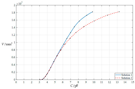 As can be seen in Section 3.2, the closed-form solution presented in this paper has a positive effect on changing the range of the nearly-linear segment. In addition, changing some design parameters, such as Young’s modulus of elasticity E and Poisson’s ratio ν, can also influence the range of the nearly-linear segment in the nonlinear relationships between the input capacitance C and the output volume V, as can be seen in Section 4.2 and Section 4.3 below.