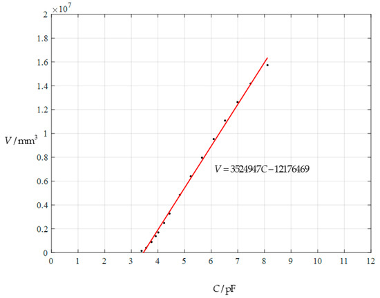 The reason why in [13], only nonlinear rain gauges are discussed, and linear rain gauges are not considered, is that the range of the nearly-linear segment obtained is too narrow for linear fitting. We will not discuss nonlinear fitting here, but only provide an example to illustrate how to conduct the linear fitting for numerically calibrating a linear rain gauge. The data for the output volume V and input capacitance C in Table 6, i.e., 146,691 mm3–15,733,468 mm3 for the output volume V and 3.385 pF–8.067 pF for the input capacitance C, are used to numerically calibrate a linear rain gauge, and the obtained linear relationship between the output volume V and input capacitance C is, via least-squares straight-line-fitting,