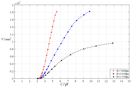 The relationships between the input capacitance C and output volume V, when a = 70 mm, h = 0.3 mm, ν = 0.45, t = 0.1 mm, g = 45 mm, and E = 1.55 MPa, 3.05 MPa, and 7.84 MPa, respectively.