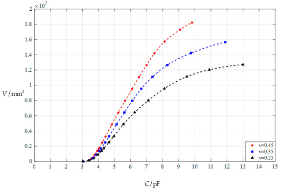 The relationships between the input capacitance C and output volume V, when a = 70 mm, h = 0.3 mm, E = 3.05 MPa, t = 0.1 mm, g = 45 mm, and ν = 0.45, 0.35, and 0.25, respectively.
