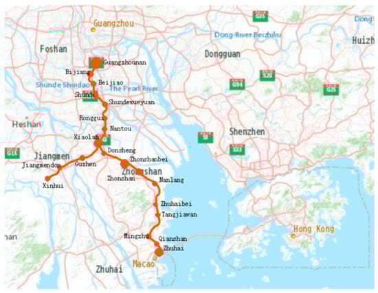 The travel of passengers on intercity high-speed railways is impacted by many factors, for example, time, space, and the environment. To improve the passenger flow prediction accuracy, the main factors and characteristics of passengers need to be analyzed and extracted. The base data of relevant factors are collected and used to analyze the characteristics of O-D passenger flow based on the Guangzhou–Zhuhai intercity high-speed railway in China, which is located in the Guangdong–Hong Kong–Macao Greater Bay Area with a length of 143 km, 20 stations, and a design speed of 250 km/h, as shown in Figure 1.