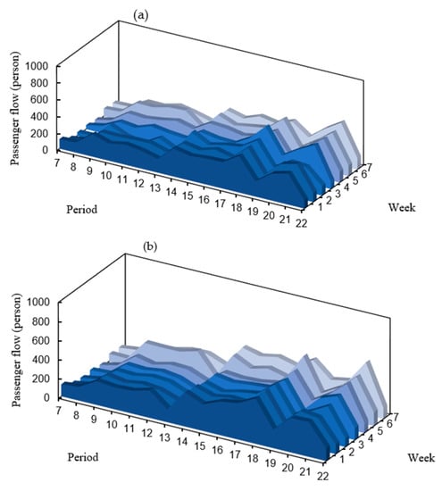 Passenger flow distribution. (a) Passenger flow distribution of the first week, (b) Passenger flow distribution of the second week.