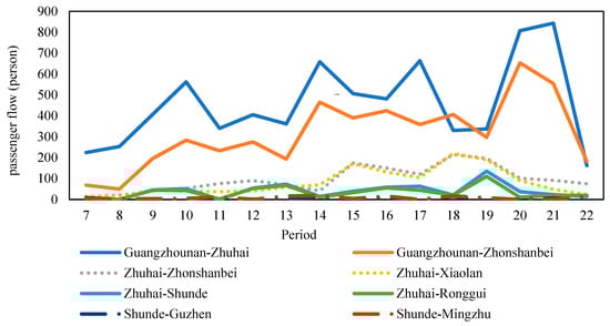 The O-D passenger flow distribution of the intercity high-speed railway is greatly impacted by spatial factors. The stations of each O-D pair are different in geographical location and technical facilities, resulting in a disparity for the passenger flow of different O-D pairs. Railway stations are often classified into several categories [], hence the 20 stations of the Guangzhou–Zhuhai intercity high-speed railway being divided in this paper into three grades, as shown in Table 1. The daily arrival and departure passenger flow of each station is distinctly different, as shown in Figure 3. The passenger flow distributions of O-D pairs with different station grades are also different, as shown in Figure 4.