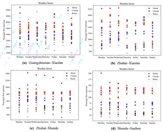 Besides the spatial and temporal factors, the short-term passenger flow of the intercity high-speed railway is also affected by the environment (such as weather and emergency). The weather of the departure stations of the passengers is mainly considered and analyzed in this paper []. The relevant weather and passenger flow data of Guangzhounan–Xiaolan, Zhuhai–Xiaolan, Zhuhai–Shunde, and Shunde–Guzhen from March to August 2015 are analyzed, as shown in Figure 5.