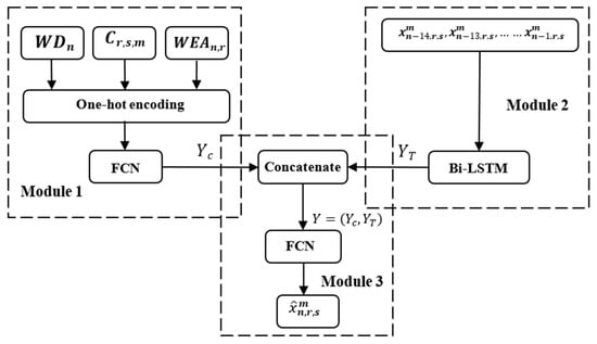 In this paper, a neural network model based on multi-source data (NN-MSD) is proposed, taking the cyclical characteristics, spatial and temporal fusion characteristics, and weather characteristics of passenger flow as the input. The input data include two parts. The first part consists of , and , which are classification data. The second part consists of historical time series data of passenger flow, that is, . Selecting a suitable neural network based on the kind of input data can increase the prediction accuracy. The bi-directional Long Short-Term Memory (Bi-LSTM) model performs well when processing time series data and extracting historical characteristics []. The fully connected network (FCN) is good at extracting potential relationships between characteristics []. Hence, a neural network architecture including 3 modules has been designed, as shown in Figure 6. An FCN model is used in the first module to process the classification data. A Bi-LSTM model is used in the second module to process the time series data. The results of the first module and the second module are spliced and fused in the third module using an FCN model. The details are as follows.