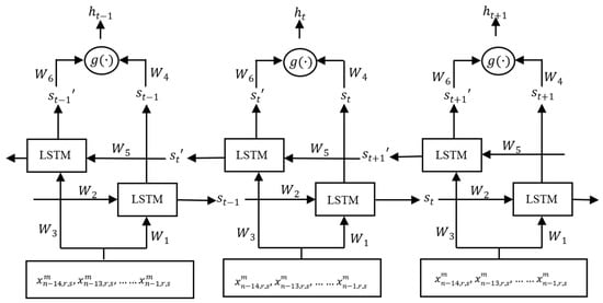 The Bi-LSTM is a model design based on the LSTM model. This model can obtain the data feature information in both directions of the hidden layer in the calculation process, which helps to improve the prediction accuracy. The structure of the Bi-LSTM model is shown in Figure 7, which contains six weight matrices, . The forward layer performs forward calculation from time 1 to time t to obtain and save data at each time, while the backward layer reverses the calculation from time t to time 1 to obtain and save the data at each time, with as the final output.