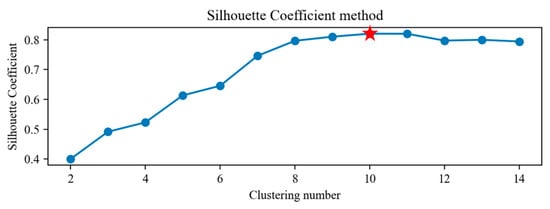 The class of the spatial and temporal fusion characteristics is calculated using the k-means algorithm (the departure station’s grade and the arrival station’s grade are presented in Section 3.1 and the average passenger flow can be calculated based on the time series data), where the best clustering number is determined by the Silhouette Coefficient method [], as shown in Figure 9. When the clustering number k = 10, the contour coefficient reaches its maximum, hence the best clustering number is 10. The clustering results of the spatial and temporal fusion characteristics for the passenger flow of the O-D pairs Guangzhounan–Mingzhu and Xiaolan–Guangzhounan are shown in Table 2.