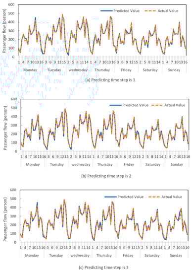 Based on the above setting, the NN-MSD model is used to predict the time-varying passenger flow of the Guangzhou–Zhuhai intercity high-speed railway. The comparison of the predicted passenger flow from Guangzhounan station to Zhongshanbei station at different times each day in one week with the actual one under different predicting time steps is shown in Figure 10. The prediction errors under different predicting time steps are shown in Table 3.