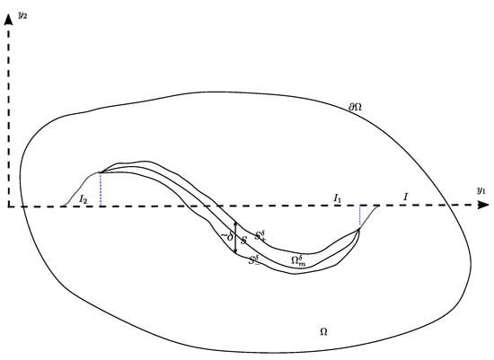 Let us give a mechanical interpretation of the differential equations and boundary conditions (28)–(33). Here, Equation (28) is the standard equilibrium equation of the body containing the thin inclusion S. Condition (29) means that the body is clamped on , while (30) means that traction is applied to . Equations (31) and (32) describe deformations of inclusion S taking into account the influence of the elastic matrix surrounding it. It is worth noting that, in the case when , not only is the jump of the tangential stress is not equal to zero, but the jump of the normal stress on S is not equal to zero as well. Moreover, these jumps are of the Ventcel type (see, e.g., works [15,22,38,39,40,41], in which analogous conditions were used for different models of elasticity). At last, Equation (33) is the boundary condition at the tips of S that are free of loads.