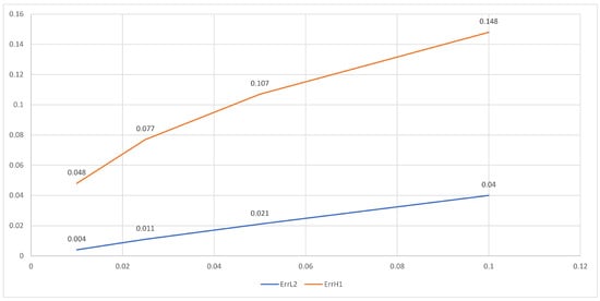 By ErrL2 and ErrH1, the relative errors of the displacements in the - and -spaces, respectively, are denoted.