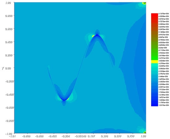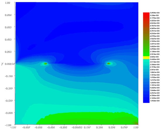 At last, the resulting deformations in the Lagrange coordinates (with the tenfold amplification factor) and the distribution of the von Mises stresses are depicted in Figure 3 for the curvilinear inclusion (case ) for the applied loading as stated at the beginning of Section 6 and in Figure 4 for the rectilinear inclusion (case ) for the non-symmetric tensile loading , where on and on . It can be seen that, in the case of the curvilinear inclusion, there is a singularity in the vicinity of the curved part of the inclusion, while in the case of the rectilinear inclusion singularity, it appears only in the vicinity of its tips. This means that the curvature k plays an essential role in modeling curvilinear inclusions.