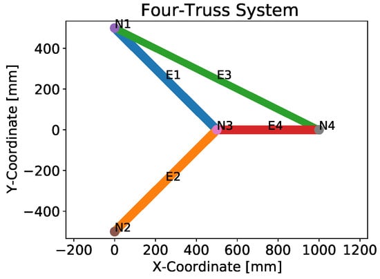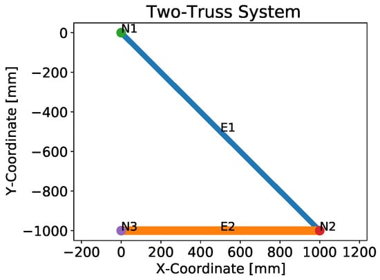 To circumvent the appearance of the absolute functions in the symbolic expressions for the truss strain, the Green–Lagrange strain formulation was implemented, as given in Equation (12). Under the infinitesimal deformation assumption, when , Equations (11) and (12) are equivalent.