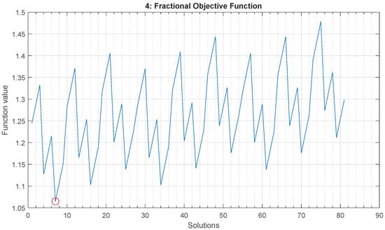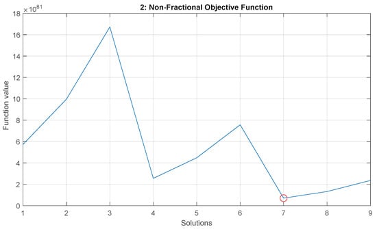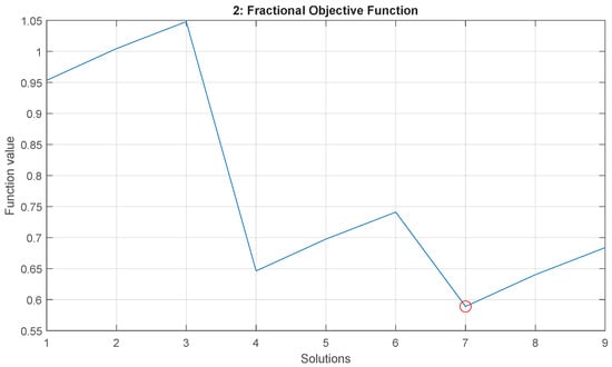Fractional objective function for the four-truss problem. Global minimum is found to be solution number 7, corresponding to .