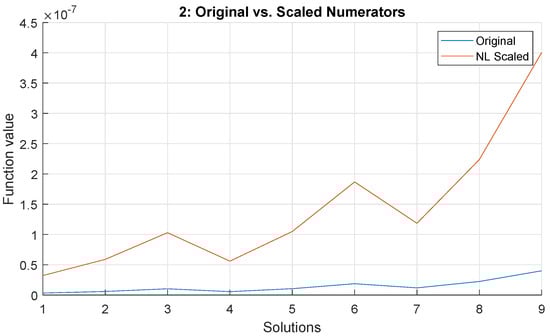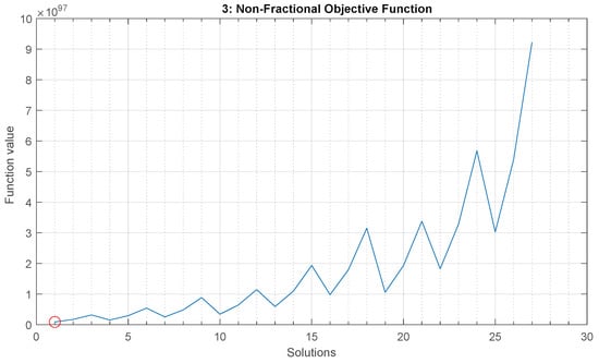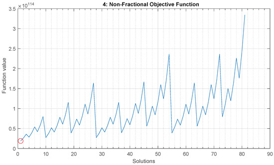 This reformulated non-fractional objective function was also tested on the sample problems, using the brute-force method [31], to see if the minimum solutions would remain the same as those of the original fractional objective function. The results of these analyses are shown in Figure 7, Figure 8 and Figure 9, with the global minimum solutions indicated with small red circles. The following global optimum solutions are obtained: