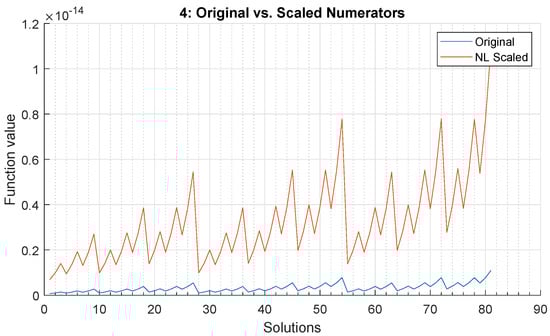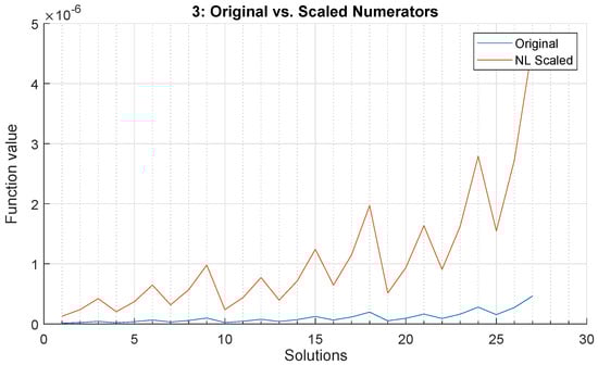 Equation (18) gives a general expression for the objective function of each of the sample problems. It is important to note that, because the truss element stresses are fractional in nature, as was shown in Equations (14)–(16), the objective function from Equation (18) will also have a fractional form. Hence, the resulting objective function is referred to as the fractional objective function. The fractional objective function was set up for each of the three sample problems, and was evaluated by a brute-force analysis, i.e., it was evaluated at every possible solution. The results for the three sample problems are shown in Figure 4, Figure 5 and Figure 6. They are produced using the Matlab code which is available online [31]. The following global minimum solutions are found: