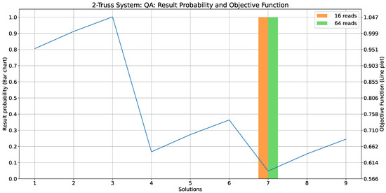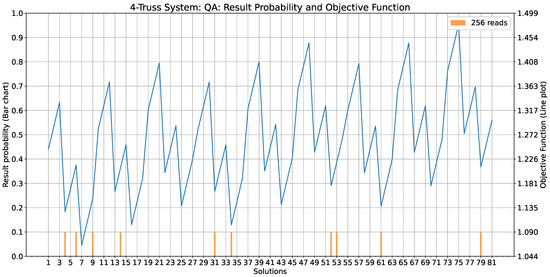The average solving time is approximately nine times longer than that for the three-truss problem, using the same number of reads. Furthermore, the average of 1.28 s of QPU access time per analysis meant that any further testing was not possible for this problem, as this would consume more than the 60 s monthly QPU access budget.