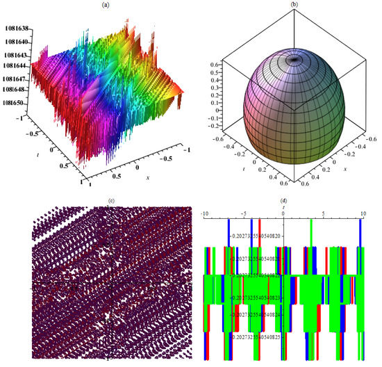 where to 4 are arbitrary parameters, while describes wave propagation in plasma physics and crystal lattice theory [1]. Many solutions have been obtained using the modified extended mapping method [1], the tanh–coth method [2], the Jacobi elliptic function and exponential rational function approaches [3], the traveling wave transformation method [4], the localized meshless radial basis function method [5], and the finite difference technique [6] with the GP equation. Selecting special values of for the above-mentioned parameters such leads to the FW [7], leads to the Rosenau–Hyman [8,9], and leads to the Fuchssteiner–Fokas–Camassa–Holm equations [9,10]. Dynamical systems and nonlinear waves in plasmas have been studied in the areas of applied physics, applied mathematics, dynamical systems, and nonlinear waves in plasmas or other nonlinear media. Plasma is rich in wave phenomena. In any plasma system, plasma particles oscillate indiscriminately and interact using electrostatic or electromagnetic forces. A qualitatively different set of waveforms is available in plasma. The study of various kinds of nonlinear waves in plasmas is an important research topic because such waves are easy to observe and the theoretical background is well established. Important plasma waves include dust acoustic waves, ion acoustic waves, dust ion acoustic waves, hybrid waves, and electrostatic cyclotron waves. Plasma is a many-body system composed of very large numbers of charged particles whose dynamics are governed by long-range collective effects via electromagnetic forces. Intuitively, one can think of it as an intriguingly conductive fluid. Analytical wave solutions for these nonlinear evolution equations have been presented in a very simple way using the bifurcation theory of planar dynamical systems [11].
