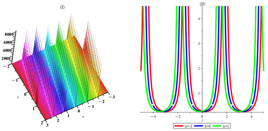 We will utilize one test to verify the obtained solutions in Section 7. We obtained the values , then the manner of acting of the periodic wave solution in Equation (153) is designed in Figure 5 by the 3D and 2D graphs. The manner of acting of the soliton solution in Equation (158) is designed in Figure 6 in the form of 3D and 2D graphs. The bright soliton manner of acting of Equation (163) is investigated in Figure 7. Moreover, the periodic wave behavior of Equation (168), and also the periodic manner of acting of Equation (173), have been designed, respectively, in Figure 8 and Figure 9 via the 3D and 2D plots. Obviously, the Figure 5, Figure 6, Figure 7, Figure 8 and Figure 9 are “the periodic wave”, “soliton”, “bright soliton”, and “periodic” wave solutions.
