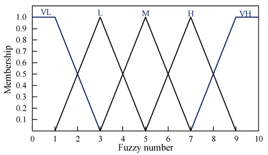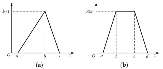 The fuzzy sets theory is applied to solve the problem of uncertainty and accuracy of decision makers in an assessment. Based on the method of information expression and quantization, a convex fuzzy set characterized by a given interval of real numbers is constructed, and the membership degree of each real number is determined to be between 0 and 1 [44,45]. The membership functions as a triangle and trapezoid are shown in Figure 1. Therefore, they can, respectively, be expressed as [46]