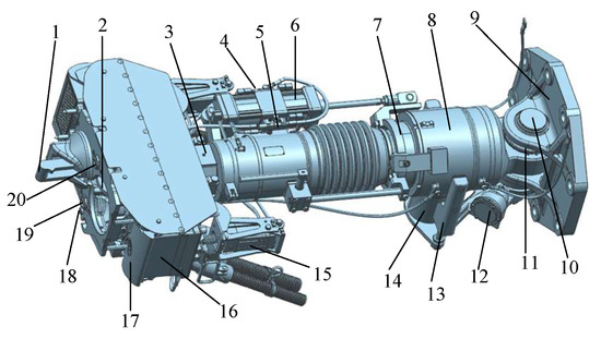 Model of the FACDG. 1—Coupling rod, 2—Coupler tongue, 3—Connecting snap ring, 4—Single electric solenoid valve, 5—Double electric solenoid valve, 6—Telescopic cylinder, 7—Collapsed pipe, 8—Rubber ring, 9—Mounting base, 10—Master pin, 11—Rubber bearing, 12—Centering device, 13—Bracket, 14—Rubber support, 15—Push cylinder, 16—Electric coupler, 17—Electric coupler cover, 18—Uncoupling pipeline valve, 19—Main pipeline valve, 20—Brake pipeline valve.