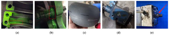 Images of failure components: (a) Cracks on upper connecting snap ring; (b) Cracks on locating pin rod; (c) Cracks and damages on the surface; (d) Valve element rusted and unable to move; (e) Air leakage at rod end.
