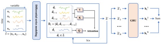 where . Then, the differential time series based on the original time series is constructed, where , and . Similar to [], to retain the positional information of the sequence, positional encoding is applied to the differential series, resulting in a series with the same dimensions as :