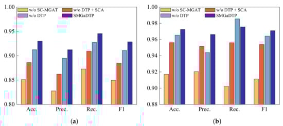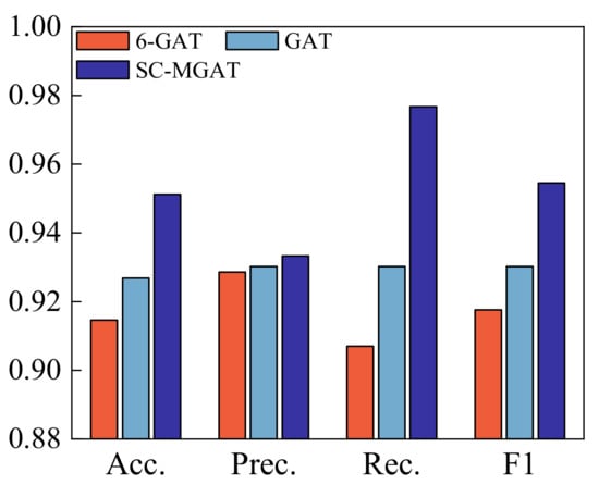 In this section, 818 events (409 positive and 409 negative samples) with relatively long node path relationships from the Weibo dataset were selected to demonstrate the differences between SC-MGAT and GAT in deep graphing. These events were used to train and test SC-MGAT and GAT, and all models used the same training parameters and experimental settings. The results are shown in Figure 7, where GAT represents a single-layer GAT and 6-GAT denotes stacking six layers of GAT. From the results, it can be observed that simply stacking multiple layers of GAT led to a decrease in performance compared with a single layer of GAT. On the other hand, SC-MGAT outperformed both the single-layer GAT and the stacked 6-GAT in all evaluation metrics. This further validates the effectiveness of our proposed approach.