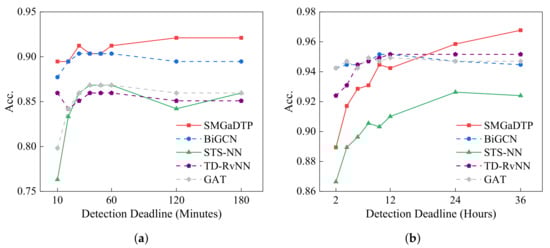 Therefore, SMGaDTP and all well-performing baseline models were subjected to early rumor detection capability testing. Specifically, early rumor detection testing requires setting a series of truncation times where only tweets published before the truncation time are used to test the detection capabilities of all models. In order to demonstrate the early detection capabilities of all models comprehensively, the truncation time on the Twitter dataset was set to {10 min, 20 min, 30 min, 40 min, 50 min, 1 h, 2 h, 3 h}, and the truncation time on the Weibo dataset was set to {2 h, 4 h, 6 h, 8 h, 10 h, 12 h, 24 h, 36 h}.