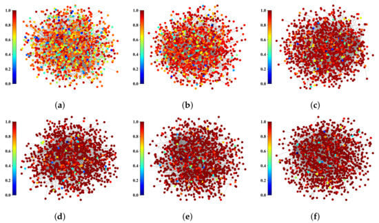 Figure 8 and Figure 9 illustrate the visualization results, where nodes with higher similarity correspond to colors closer to deep red. From the visualization results, it can be observed that the traditional GAT exhibited oversmoothing phenomena after only three layers of message passing. This is consistent with the experimental results that showed a performance decrease when stacking multiple layers of GAT. In contrast, SC-MGAT maintained a higher level of node discrimination even after six layers of message passing, effectively avoiding the problem of oversmoothing.