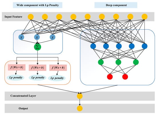 Finally, the concatenated layer combines the outputs of the wide component with ℓp Penalty and the deep component. Then, it exports the final credit risk prediction by feeding the combined features to the activation function. In particular, the concatenated layer can deal with the weighted sum of these two modules together and optimize the learning parameters, simultaneously. The concatenated layer mainly consists of a fully connected layer. We denote the predicted credit risk by Y, which can be calculated as follows [],