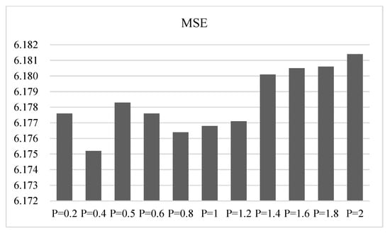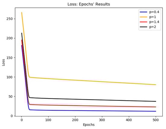The convergence of the model was compared for 500 epochs with ℓp Penalty = 0.4, 1, 1.4, and 2 as examples. The MSE was used to evaluate the convergence rate. The experimental results are shown in Figure 7. The X-axis records the number of epochs, the Y-axis records the loss score, the blue line corresponds to p = 0.4, the yellow line corresponds to p = 1, the red line corresponds to p = 1.4, and the black line corresponds to p = 2. It is evident that ℓp Penalty = 0.4 has the fastest convergence rate and is the most stable on credit risk assessment.