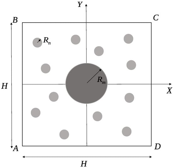 To simulate the flow of a viscous fluid in a mixed filter consisting of parallel solid inclusions of a cylindrical shape, let us select a square periodic cell with a side H (Figure 1). In the center of the cell, a microfiber of a radius is located. The rest of the cell volume is occupied by N nanofibers, each of a radius , which are located randomly. A common fiber packing density is defined as the ratio of the volume of all fibers to the cell volume V [7]: