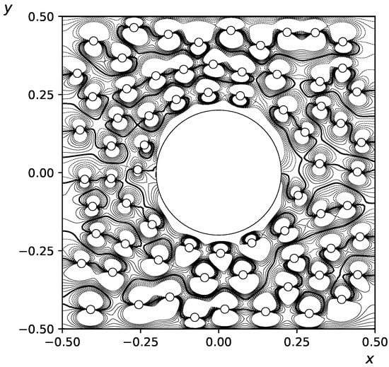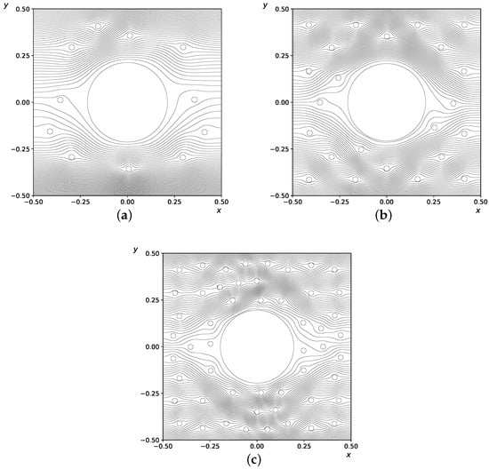 In mixed filters, both microfibers and nanofibers are located randomly in a general packing. To form a random distribution of nanofibers around a microfiber in a periodic cell, the method of the best candidate Mitchell [55] was used. In Figure 2, the streamlines of flow in a periodic element for the values of the parameters , , and various mass fractions (a), (b), (c) are presented.