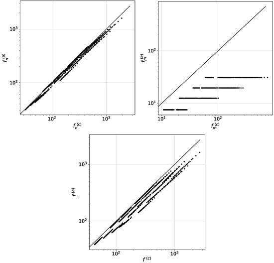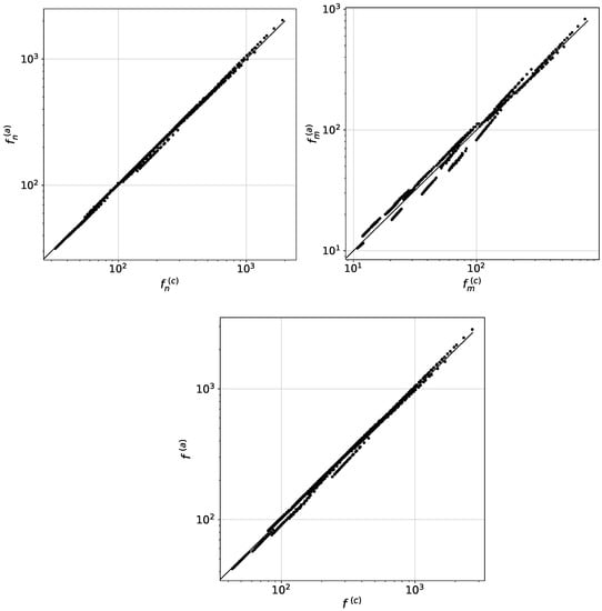 Figure 3 shows cross-plots of a comparison of the drag forces , , and found from the numerical model with the values , , and determined from the analytical Formulas (22) and (23). Here and below, the superscripts “” and “” mean the value of the parameter found from the numeric model and analytical formulas. Dots in Figure 3 show the values averaged over 100 calculations of forces for a certain set of parameter values from Table 1. The number of points that correspond to the number of used parameters is six hundred. The diagonal line corresponds to the locus of points for which the values of the forces determined during the calculations coincide with the values of the forces, found by analytical formulas. It can be seen from the graphs that both the total drag forces and drag forces of the microfiber, found by the analytic Formulas (22) and (23), significantly differ from their values obtained by the numerical model.