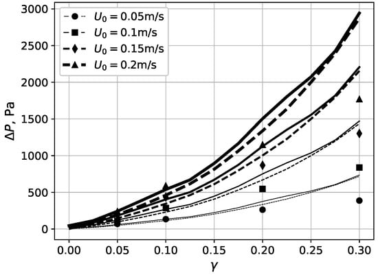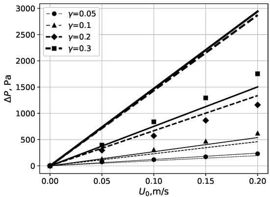 Dependence of pressure drop on flow velocity : solid and dashed lines correspond to the numerical model and approximate analytical formulas, respectively; the marks are the experimental data from [45].
