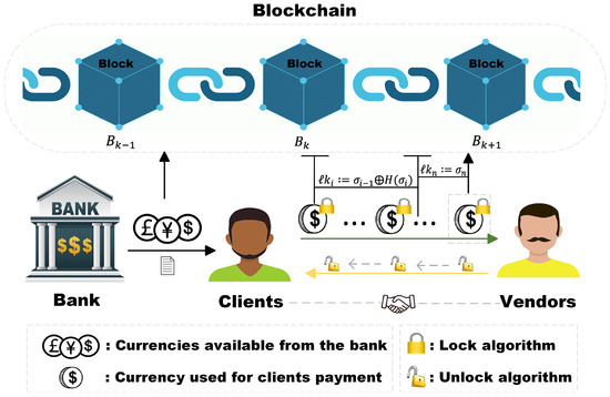 - Bank (B): B acts as the transaction overseer and does not facilitate payment channels for users (clients and vendors) with low reputation scores. Once the transaction is initiated, the bank sends the total transaction amount and the signatures of the transaction messages (transaction amount, parts of both parties’ identification information, and send time) to the clients.