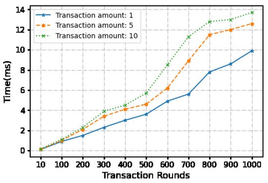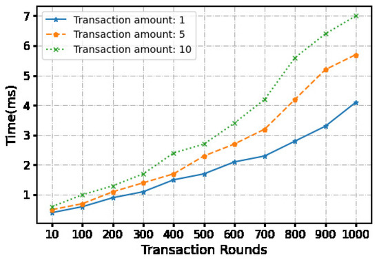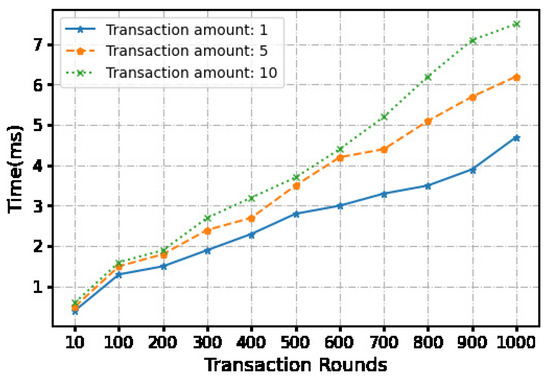 During the stage, the bank is required to verify the reputation value of both transaction parties. The client needs to receive the total transaction amount, the signature, and some identification information of both parties from the bank. We used 40-bit characters to denote the bank-generated signature and found the average transaction time to be s. During the phase, users employ a signature generator to produce signatures for each transaction. Subsequently, the lock is created via the lock algorithm and transmitted to the vendor over 10,000 consecutive transactions. The measured average transaction time was s. Table 3 records the time and cost of 10,000 consecutive transactions using the off-chain channel with a transaction amount of USD 10.