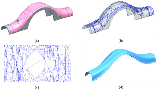 Geometry repair based on NURBS surface fitting: (a) the axle housing model with undesired features, (b) Delaunay triangulation, (c) reparameterization for surface fitting, (d) undesired NURBS surface obtained by geometry repair.