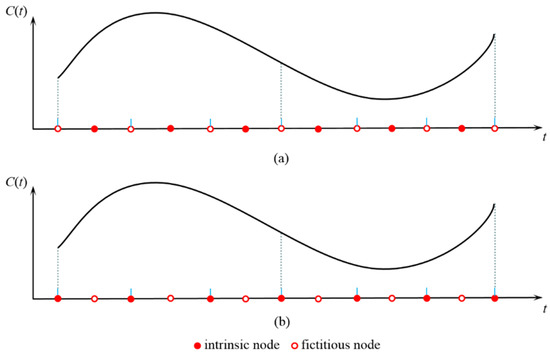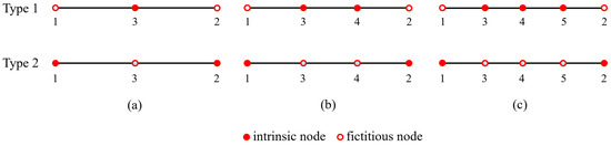 For continuous curve representation, arbitrary types of dual interpolation elements can characterize continuous curves. As shown in Figure 7, intrinsic or fictitious nodes can be distributed on the boundaries of the elements. In this case, the dual interpolation elements are equivalent to the conventional interpolation elements. By adding fictitious and intrinsic nodes inside or at the vertices of the elements, the dual interpolation curve is flexible and adaptable to characterize the continuous curve.