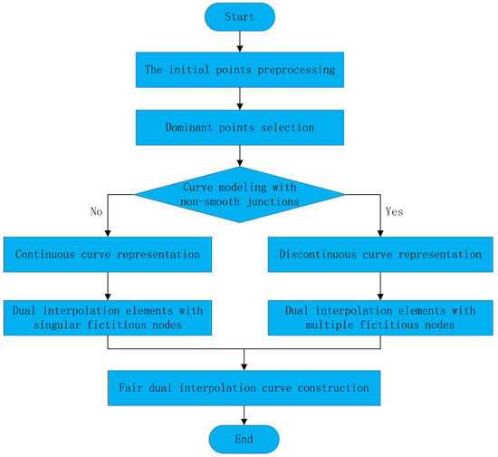 The dual interpolation curve modeling method takes well-known steps by preprocessing the initial points, dominant point selection, and fair dual interpolation curve construction (see Figure 5). However, the uniqueness of the proposed approach lies in dominant point selection and fair dual interpolation curve construction for smooth curve modeling.