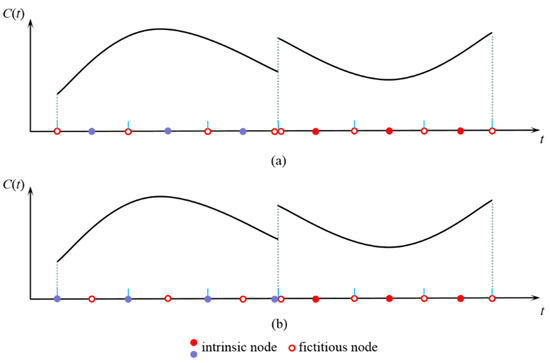Schematic of the dual interpolation curve for discontinuous curve modeling: (a) Type 1, (b) Type 2.