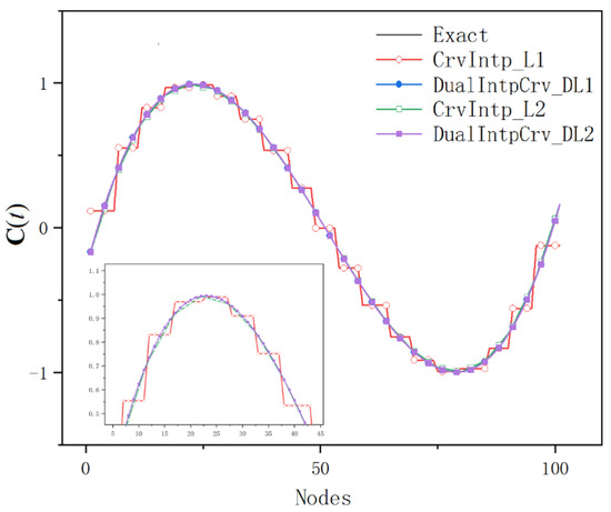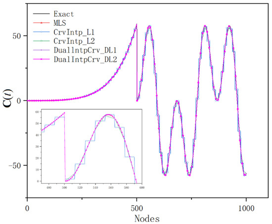 This example is given to discuss the reliability, stability, and convergence behavior of the dual interpolation curve compared with other conventional methods. The dual interpolation curve is implemented by 40, 80, 160, and 320 elements to study the convergence performance. For a fair comparison, conventional interpolation methods and the MLS approximation are implemented by searching the smooth range of the piecewise function. When determining the influence domain in the MLS approximation, the discontinuous point is deemed as the opaque node; that is, the reference nodes beyond the discontinuous point are not included. As illustrated in Figure 16 and Figure 17, high flexibility and superior performance can be affirmative in the implementation of the dual interpolation curve. The curve modeling results of the dual interpolation curve with a total of 80 different types of dual interpolation elements and other methods are shown in Figure 18. Due to the existence of multiple nodes at the discontinuous boundary, discontinuous curve representation can be naturally characterized by the dual interpolation curve.