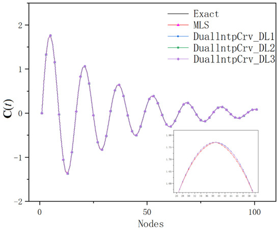 where (i = 1, 2,…, M) are the weight functions of intrinsic nodes in the neighborhood of the given fictitious node, , t represents the parameter values of points on the dual interpolation curve, and is the basis function vector of relating intrinsic nodes. Note that the fictitious nodal values are different from the intrinsic nodal values of in general. More details of the MLS approximation are available in [26,27].