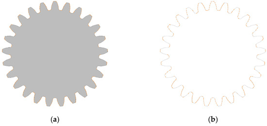This example demonstrates the potential advantages of the dual interpolation curve to deal with complex geometry models in a fully automated manner. The real-world geometries of the gear were downloaded from the web without any feature removal or alteration. The outer contour of the gear model is comprised of a few short edges, which causes some problems in mesh generation and further analysis. An entire dual interpolation curve is constructed around the boundary of the gear based on the adaptive curve refinement technique.