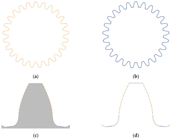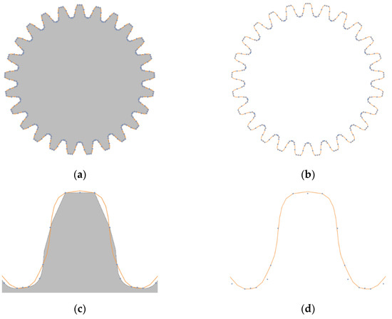 Distribution of the sample points along the boundary of the gear model: (a) the ultimate dual interpolation curve, (b) distribution of the sample points, (c) non-smooth junctions in the gear model, (d) enlarged view of the dual interpolation curve.