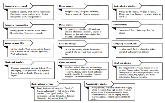 The OWASP revised its top 10 IoT vulnerabilities in 2018 [106]. The list includes (a) hard-coded or easily crackable passwords; (b) network services that are not secure; (c) ecosystem interfaces that are not secure; (d) a lack of secure update mechanisms; (e) the use of faulty or outdated components; (f) insufficient privacy protection; (g) insecure data transfer and storage; (h) a lack of device management; (i) insecure default settings; and (j) a lack of physical hardening.