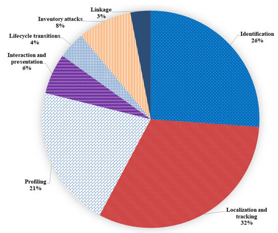 The literature on IoT threats shows that location monitoring 31.5 percent is the hazard that people are most concerned about, followed by the sharing of unanonymized data 25.9 percent. Concerns about profiling were brought up in 21.3 percent of the research, followed by inventory attacks at 8.3 percent, interaction and presentation at 6.5 percent, life cycle transitions at 3.7 percent, and connecting at 2.7 percent (Figure 5) [108,109,115,116].