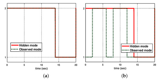 where the system state consists of the position , the velocity , and the actuator state ; denotes the speed of the actuator; and are gains; and represents the influence of velocity on the actuator. Specifically, the value of is changed according to the Markov process of system mode , which is affected by the environment on the actuator, or internal factors, such as temperature, humidity, and lifespan.